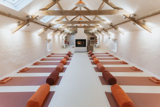 An ideal space for mat work and sitting workshops. Natural light streams through skylights that highlight the vaulted ceiling and lime-washed decor.